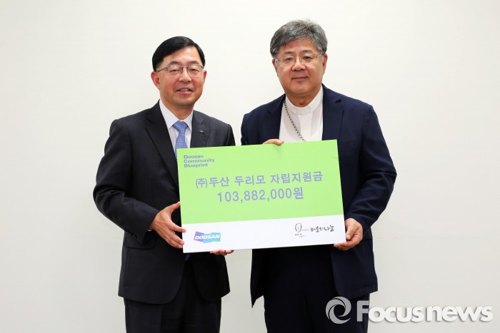 (서울=포커스뉴스) 두산은 3일 서울 중구 명동 천주교 서울대교구청에서 재단법인 '바보의 나눔'에 두리모 자립 지원금 1억여원을 전달했다고 밝혔다.