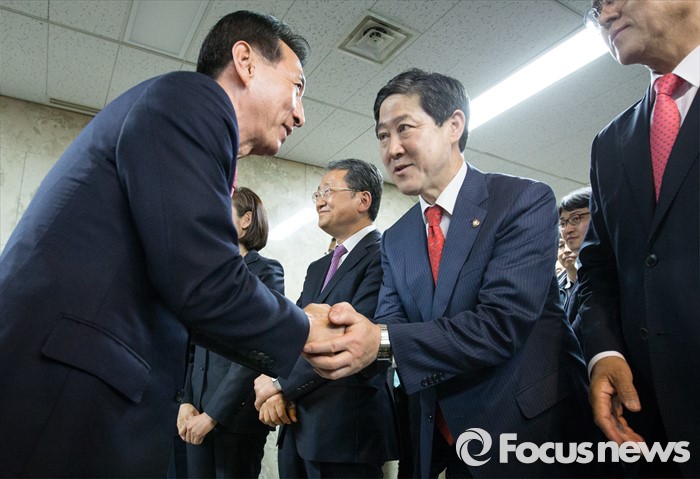 (서울=포커스뉴스) 유기준(가운데) 원내대표 후보자가 3일 오후 서울 여의도 국회에서 열린 새누리당 원내대표, 정책위의장 선출 및 당선자 총회에 참석해 의원들과 인사하고 있다.