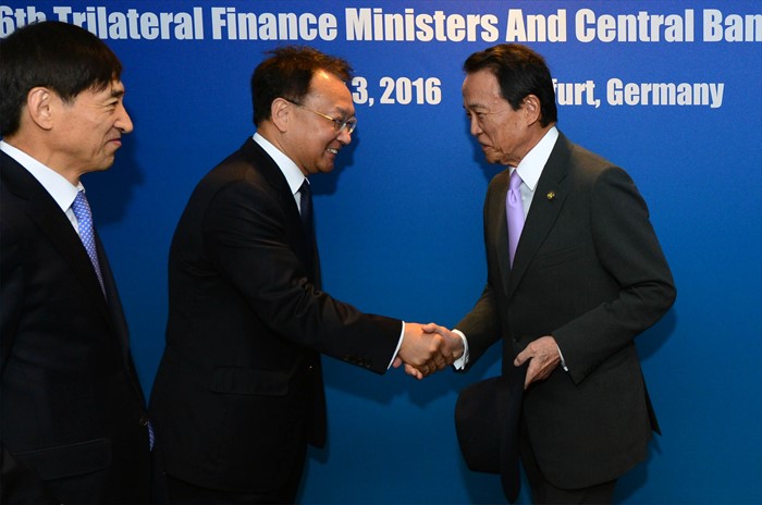 (서울=포커스뉴스) ADB연차 총회 참석차 독일 프랑크푸르트를 방문 중인 유일호 부총리 겸 기획재정부 장관이 5월 3일(현지시간) 메리어트호텔에서 열린 제16차 한·중·일 재무장관회의에 참석해, 아소다로 일본 재무장관과 악수하며 인사를 나누고 있다. <사진제공=기획재정부>