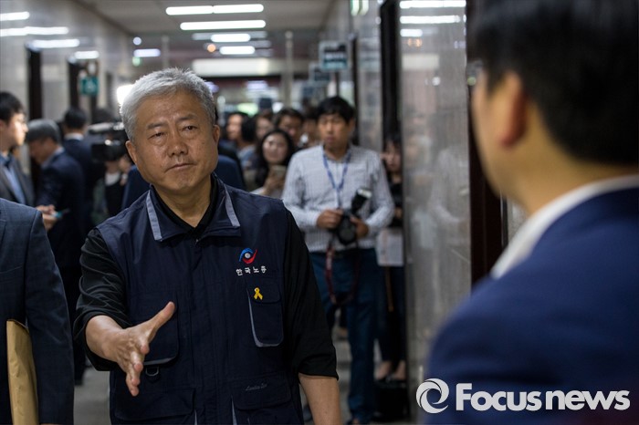 (서울=포커스뉴스) 김동만 한국노총 위원장이 3일 오후 서울 여의도 국회에서 김종인 더불어민주당 비상대책위 대표와 간담회를 하기 위해 당대표실로 향하고 있다.