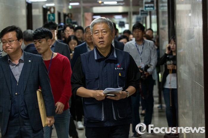 (서울=포커스뉴스) 김동만 한국노총 위원장이 3일 오후 서울 여의도 국회에서 김종인 더불어민주당 비상대책위 대표와 간담회를 하기 위해 당대표실로 향하고 있다.