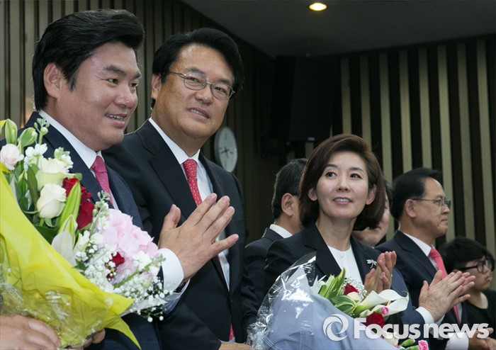 (서울=포커스뉴스) 3일 오후 서울 여의도 국회에서 열린 새누리당 20대 국회 첫 원내대표 및 정책위의장 선출을 위한 당선자 총회에서 선출된 신임 원내지도부와 현 지도부가 포즈를 취하고 있다. 왼쪽부터 원유철 대표최고위원 권한대행, 정진석 신임 원내대표, 나경원 의원.