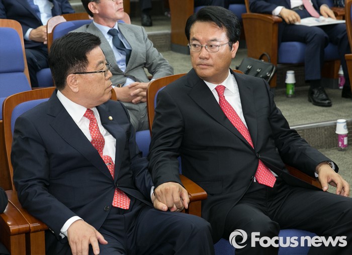 (서울=포커스뉴스) 3일 오후 서울 여의도 국회에서 열린 새누리당 20대 국회 첫 원내대표 및 정책위의장 선출을 위한 당선자 총회에서 선출된 정진석(오른쪽) 신임 원내대표와 김광림 신임 정책위의장이 당선이 확정되자 손을 잡고 있다.