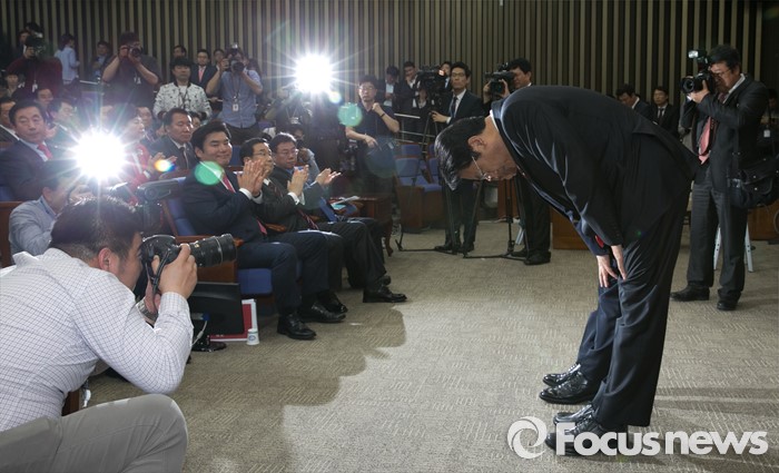 (서울=포커스뉴스) 3일 오후 서울 여의도 국회에서 열린 새누리당 20대 국회 첫 원내대표 및 정책위의장 선출을 위한 당선자 총회에서 선출된 정진석 신임 원내대표와 김광림 신임 정책위의장이 소감을 전한 뒤 인사하고 있다.