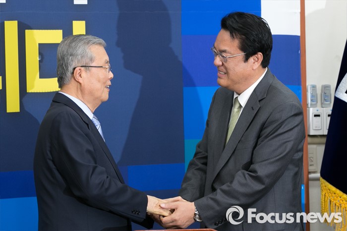 (서울=포커스뉴스) 정진석(오른쪽) 새누리당 신임 원내대표가 4일 오전 서울 여의도 국회에서 김종인 더불어민주당 대표를 예방해, 악수하고 있다.