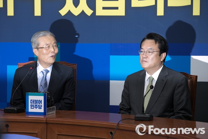 (서울=포커스뉴스) 김종인(왼쪽) 더불어민주당 대표가 4일 오전 서울 여의도 국회 더민주 당대표실에서 정진석 새누리당 신임 원내대표와 만나, 인사말을 하고 있다.