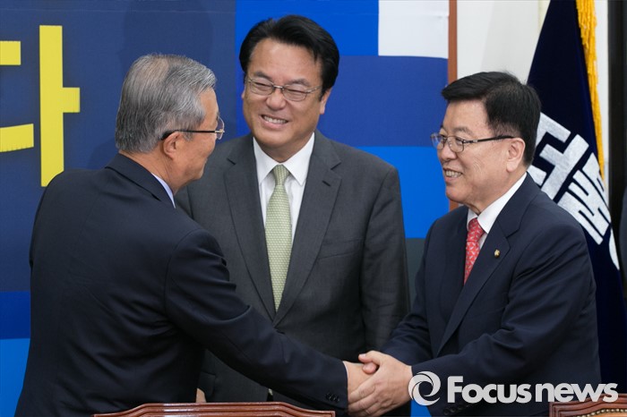 (서울=포커스뉴스) 정진석(가운데) 새누리당 신임 원내대표와 김광림(오른쪽) 신임 정책위의장이 4일 오전 서울 여의도 국회에서 김종인 더불어민주당 대표를 예방해, 악수하고 있다.