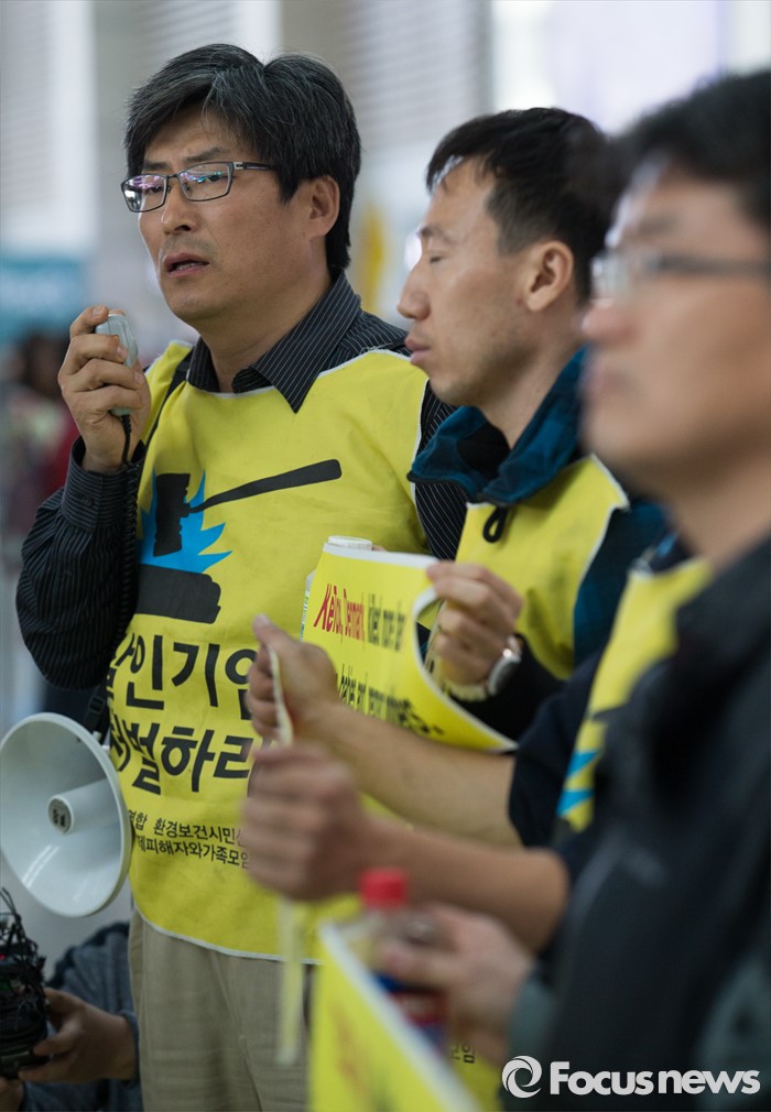 (인천공항=포커스뉴스) 4일 오전 인천국제공항 출국장에서 가습기 살균제 피해자 가족 모임과 환경보건시민센터 관계자들이 옥시레킷벤키저 영국 본사에 항의하기 위해 출국하기 전 기자회견을 하고 있다. 이들은 영국 런던에서 열리는 옥시레킷벤키저의 연례주주총회를 방문할 예정이다.
