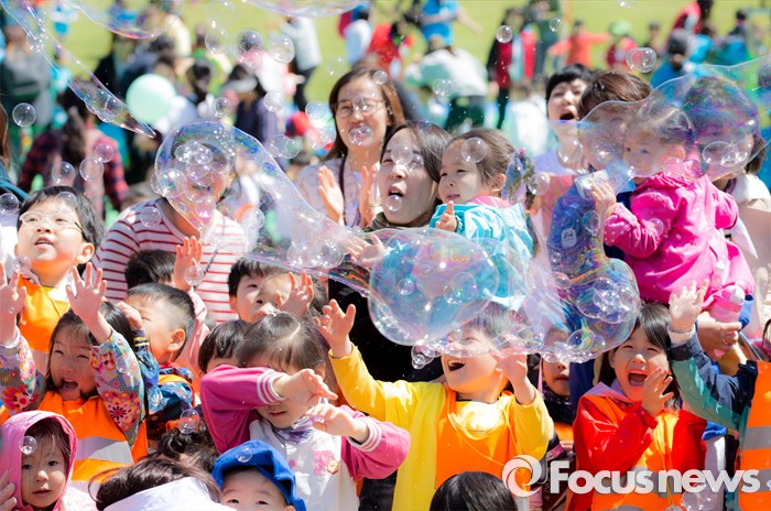 (서울=포커스뉴스) 어린이날을 하루 앞둔 4일 오전 서울 마포구 월드컵공원 난지잔디광장에서 2016 마포어린이축제에 참가한 어린이들이 버블쇼를 보며 즐거운 시간을 보내고 있다.