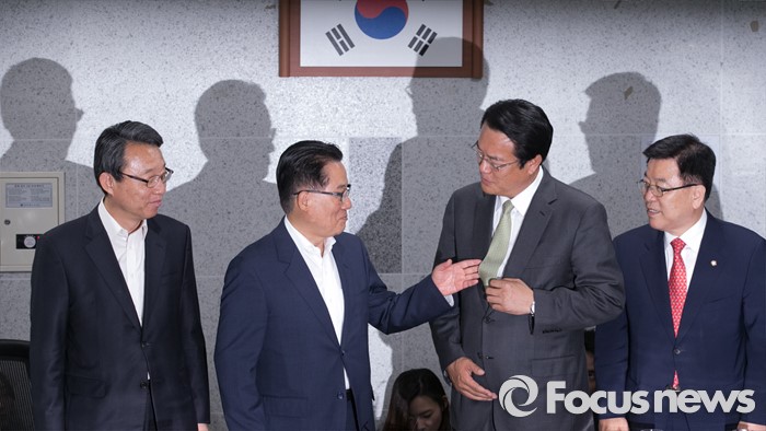 (서울=포커스뉴스) 새누리당 신임 원내지도부가 4일 오전 서울 여의도 국회 의원회관에서 국민의당 원내지도부를 예방, 취재진을 향해 포즈를 취하며 대화하고 있다. 오른쪽부터 김광림 새누리당 신임 정책위의장, 정진석 신임 원내대표, 박지원 국민의당 원내대표, 김성식 정책위의장.