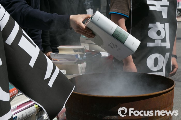(서울=포커스뉴스) 사법시험 존치를 위한 고시생모임 회원들이 4일 오전 서울 여의도 더불어민주당사 앞에서 사시존치 법안을 19대 국회 임기내에 본회의에 상정할 것을 주장하며, 연막탄을 피운채 분서갱유 퍼포먼스를 하고 있다.