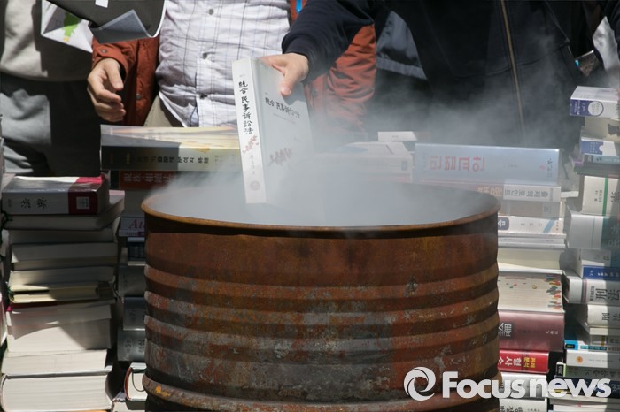 (서울=포커스뉴스) 사법시험 존치를 위한 고시생모임 회원들이 4일 오전 서울 여의도 더불어민주당사 앞에서 사시존치 법안을 19대 국회 임기내에 본회의에 상정할 것을 주장하며, 연막탄을 피운채 분서갱유 퍼포먼스를 하고 있다.