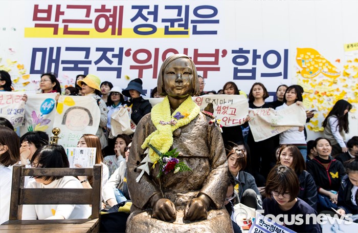 (서울=포커스뉴스) 4일 오후 서울 종로구 옛 일본대사관 앞에서 제1229차 일본군 위안부 문제해결을 위한 정기 수요집회가 열리고 있다.