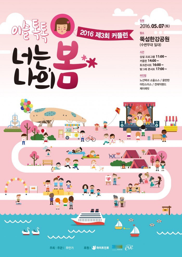 하이트진로 마케팅실 이강우 상무는 "주류업계 최초의 캐릭터 마케팅, 뷰티 마케팅 등 새로운 마케팅으로 주목 받고 있는 이슬톡톡이 이번에는 2030세대 커플들을 대상으로 하는 커플런 행사를 통해 소비자들에게 더욱 친근하게 다가가고자 한다"며 "이슬톡톡과 함께하는 다양한 이벤트와 공연 등이 준비돼 있어 참가하는 커플들에게 톡톡 튀는 색다른 경험이 될 것"이라고 말했다.커플런 '이슬톡톡 너는 나의 봄' 개최를 알리는 포스터.<사진제공=하이트진로>