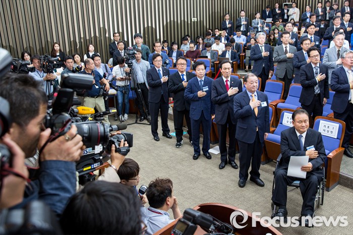 (서울=포커스뉴스) 4일 오후 서울 여의도 국회에서 열린 더불어민주당 원내대표 선거에서 후보들이 국민의례를 하고 있다. 오른쪽부터 이상민 후보, 강창일 후보, 우상호 후보, 노웅래 후보, 민병두 후보, 우원식 후보.