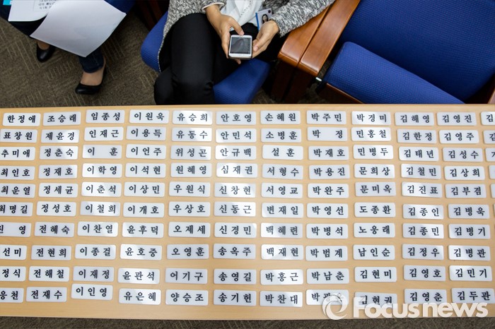 (서울=포커스뉴스) 4일 오후 서울 여의도 국회에서 열린 더불어민주당 원내대표선거에서 선거인 명패가 놓여져 있다.