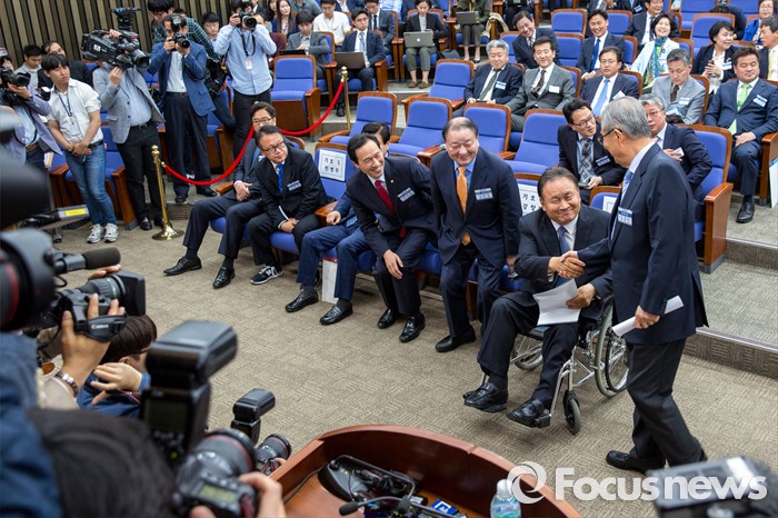 (서울=포커스뉴스) 김종인 더불어민주당 비상대책위 대표가 4일 오후 서울 여의도 국회에서 열린 원내대표 선거에 참석해 후보들과 악수 하고 있다.