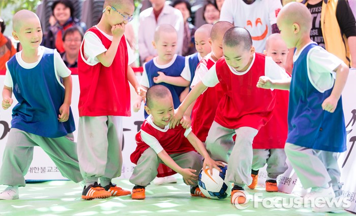 (서울=포커스뉴스) 4일 오후 서울 종로구 조계사 대웅전 앞에서 조계사와 홍법사 동자스님들이 축구대회에 참가해 실력을 겨루고 있다.