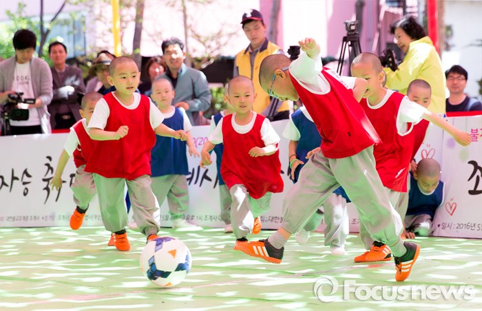 (서울=포커스뉴스) 4일 오후 서울 종로구 조계사 대웅전 앞에서 조계사와 홍법사 동자스님들이 축구대회에 참가해 실력을 겨루고 있다.