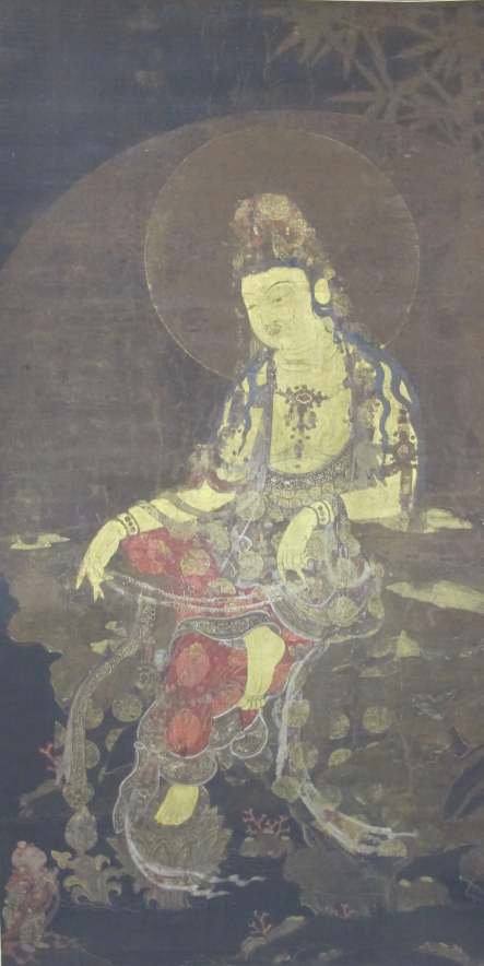 화면 가운데에는 이중의 둥근 광배를 갖추고 수정염주를 굴리며 보타락가산의 금강바위에 반가좌로 앉은 관음보살이 압도적인 크기로 묘사됐다. 향 왼쪽 하단에는 무릎을 구부려 합장하며 보살도를 묻는 선재동자를 조그맣게 표현했다.