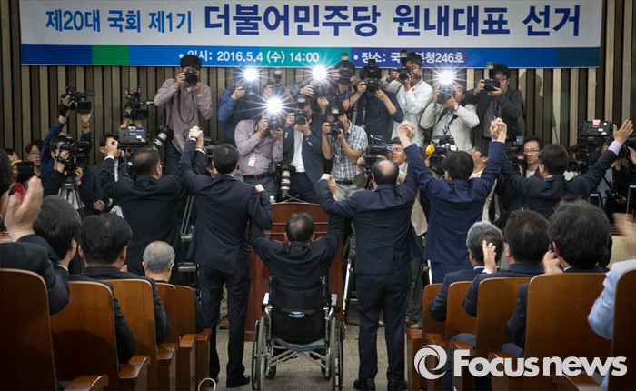 (서울=포커스뉴스) 4일 오후 서울 여의도 국회에서 열린 더불어민주당 20대 국회 1기 원내대표 선출을 위한 당선자 총회에 참석한 원내대표 후보들이 취재진을 향해 포즈를 취하고 있다.