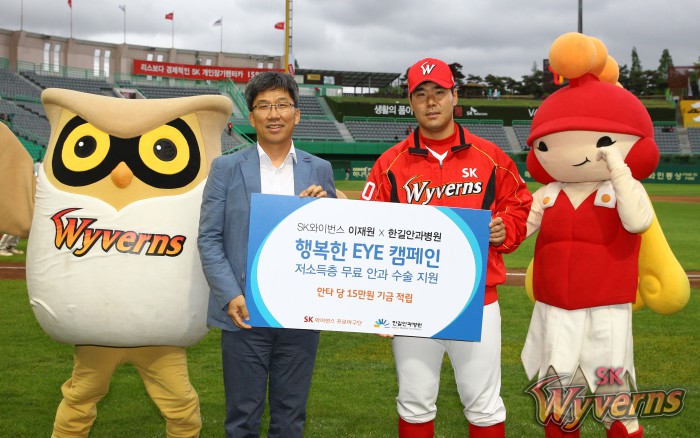 이재원은 "더 많은 이웃을 돕고 싶다. 올시즌 더욱 분발해 더 많은 분들께 희망을 드릴 수 있도록 노력하겠다"고 전했다.프로야구 SK 이재원(오른쪽)이 올시즌 인천 한길안과병원과 함께 저소득층 무료 안과수술 지원을 위한 '행복한 EYE 캠페인'을 진행한다. <사진제공=SK 와이번스>