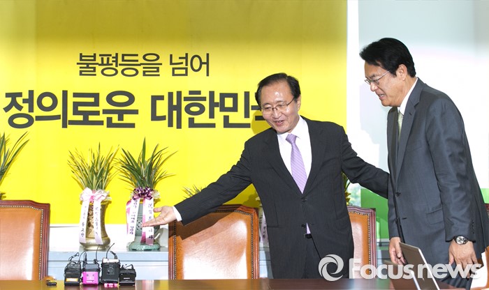 (서울=포커스뉴스) 정진석(오른쪽) 새누리당 신임 원내대표가 4일 오후 서울 여의도 국회에서 노회찬 정의당 원내대표를 예방, 함께 자리로 향하고 있다.