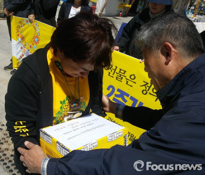 전국교직원노동조합 서울지부는 4일 오전 서울 광화문 광장에서 '세월호 참사 2주기, 기억 행동 엽서 전달식'을 갖고 서울 시내 300여개 학교 학생들이 쓴 엽서 3만8500장을 세월호 유가족에 전달했다.