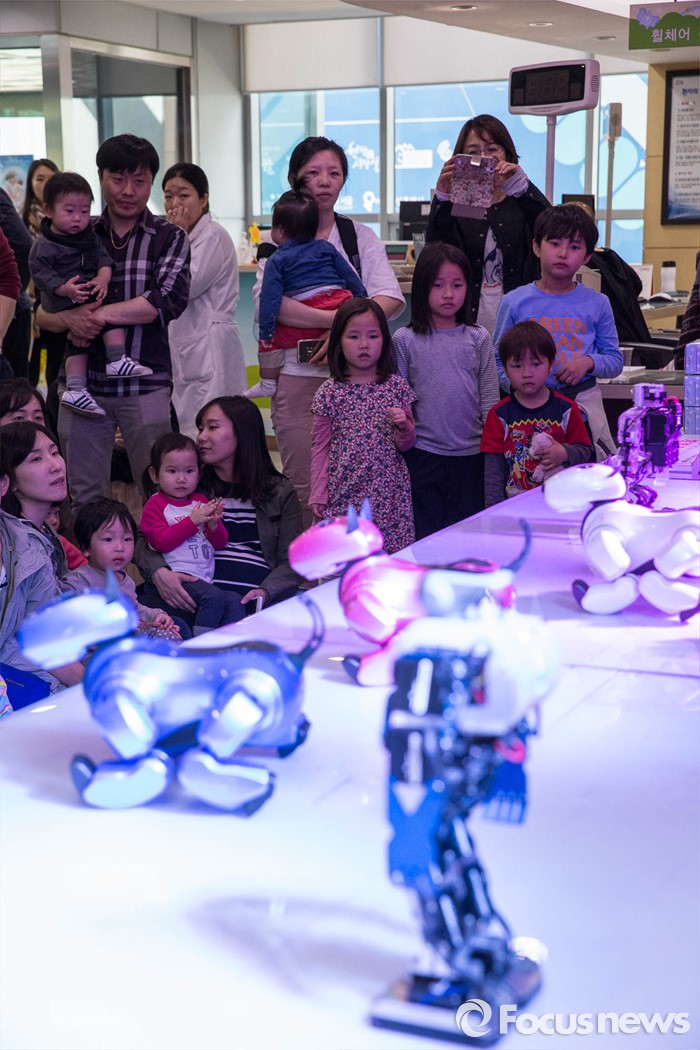 (서울=포커스뉴스) 어린이날을 앞둔 4일 오후 서울 서초구 서울시어린이병원에서 열린 '로봇댄스 및 체험' 행사에 참가한 어린이들이 공연을 관람하고 있다.