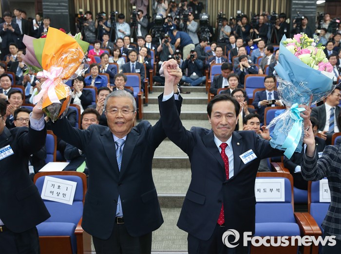 (서울=포커스뉴스) 4일 오후 서울 여의도 국회에서 더불어민주당 20대 국회 1기 원내대표 선출을 위한 당선자 총회에 참석한 김종인(왼쪽) 비대위 대표와 우상호 신임 원내대표가 취재진을 향해 포즈를 취하고 있다.