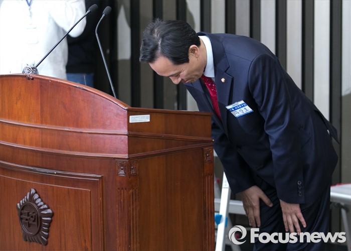(서울=포커스뉴스) 4일 오후 서울 여의도 국회에서 열린 더불어민주당 20대 국회 1기 원내대표 선출을 위한 당선자 총회에서 선출된 우상호 신임 원내대표가 소감을 전한 뒤 인사하고 있다.