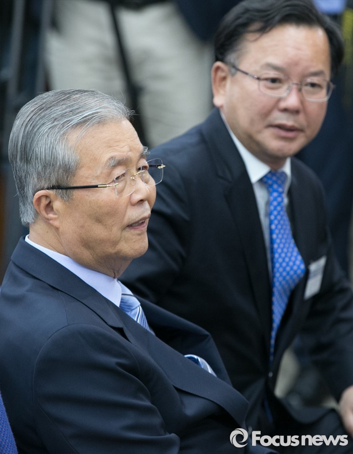 (서울=포커스뉴스) 4일 오후 서울 여의도 국회에서 열린 더불어민주당 20대 국회 1기 원내대표 선출을 위한 당선자 총회에 참석한 김종인(왼쪽) 비대위 대표와 김부겸 당선인이 대화하고 있다.