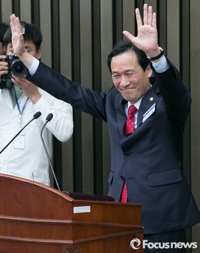(서울=포커스뉴스) 4일 오후 서울 여의도 국회에서 열린 더불어민주당 20대 국회 1기 원내대표 선출을 위한 당선자 총회에서 선출된 우상호 신임 원내대표가 총회 산회를 선포한 뒤 손을 들어 인사하고 있다.