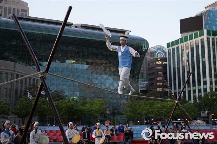 (서울=포커스뉴스) 4일 오후 서울시청 광장에서 열린 '광대 줄타기 연희 한마당'에서 솟대쟁이패 단원들이 줄타기 공연을 하고 있다.