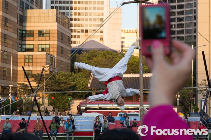 (서울=포커스뉴스) 4일 오후 서울시청 광장에서 열린 '광대 줄타기 연희 한마당'에서 솟대쟁이패 단원들이 멋진 공연을 하고 있다.