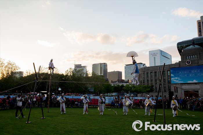 (서울=포커스뉴스) 4일 오후 서울시청 광장에서 열린 '광대 줄타기 연희 한마당'에서 솟대쟁이패 단원들이 줄타기 공연을 하고 있다.