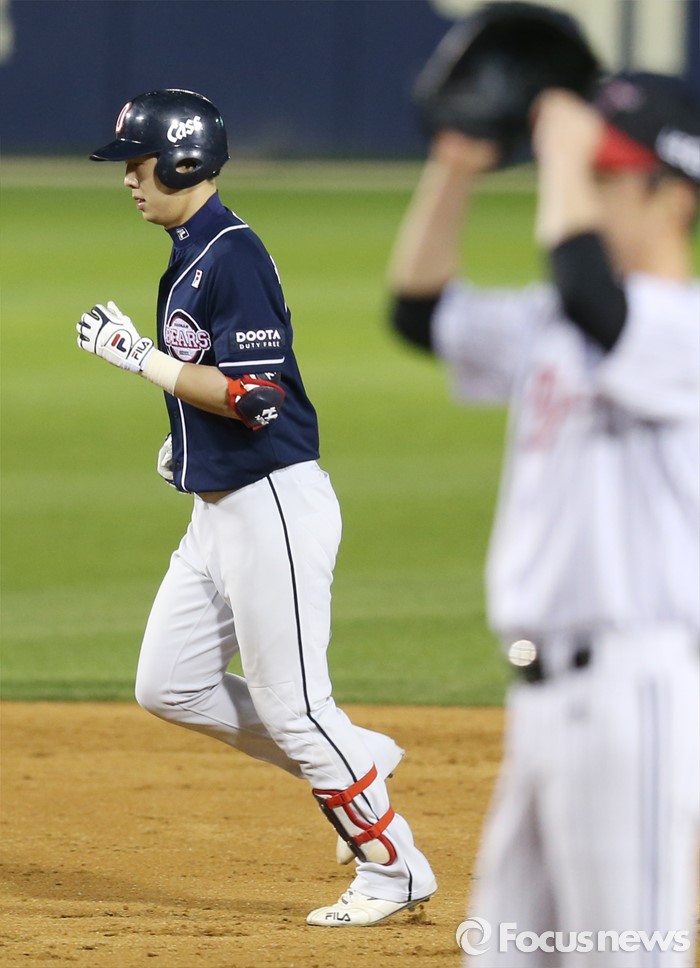 (서울=포커스뉴스) 4일 서울 잠실구장에서 열린 2016 프로야구 두산-LG 경기 5회초 2사 1,2루에서 두산 박건우가 좌월 3점 홈런을 치고 베이스를 돌고 있다. 오른쪽은 LG 투수 진해수.