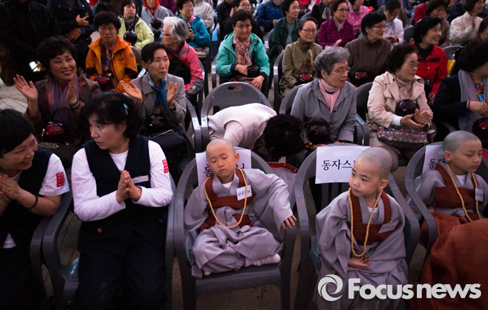 (서울=포커스뉴스) 4일 오후 서울 종로구 조계사에서 열린 연등 점등식에 참석한 한 동자승이 졸음을 참지 못해 잠들어 있다.