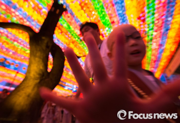 (서울=포커스뉴스) 4일 오후 서울 종로구 조계사에서 열린 연등 점등식에서 한 동자승이 손바닥으로 취재진의 카메라를 가리며 장난을 부리고 있다.