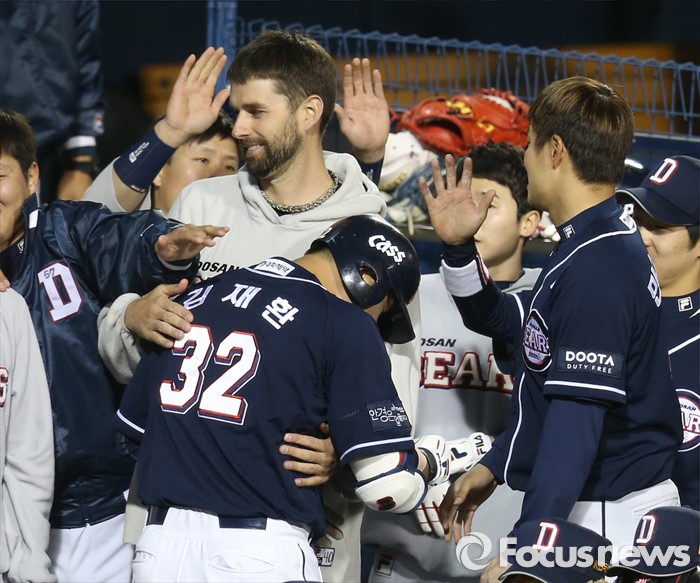(서울=포커스뉴스) 4일 서울 잠실구장에서 열린 2016 프로야구 두산-LG 경기 6회초 1사 1,3루에서 두산 김재환이 우월 3점 홈런을 치고 덕아웃에서 니퍼트와 포옹하고 있다.