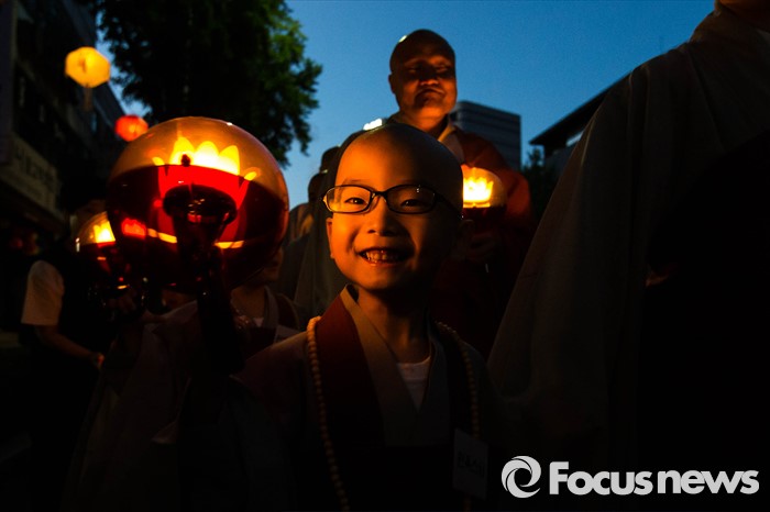 (서울=포커스뉴스) 조계사 스님과 동자승들이 4일 오후 서울 종로구 조계사에서 열린 연등 점등식이 끝나고 거리 행진을 하고 있다.