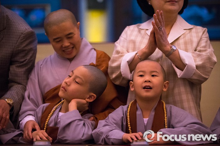 (서울=포커스뉴스) 4일 오후 서울 종로구 조계사에서 열린 연등 점등식에 참석한 한 동자승이 점등식 직전 졸음을 참지 못해 졸고 있다.