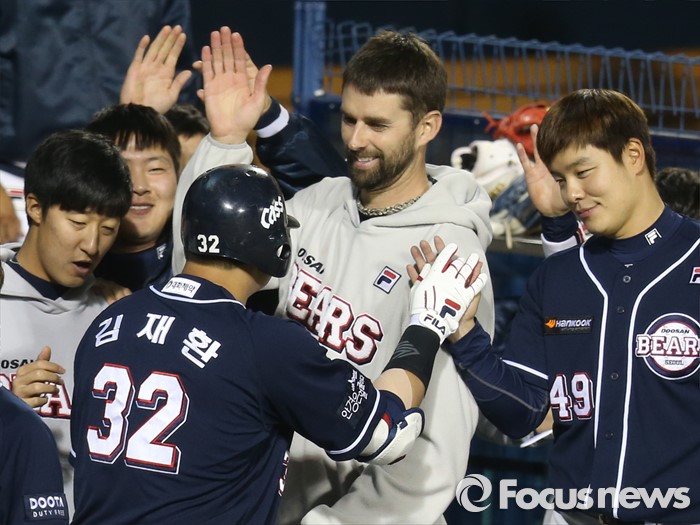 | △ 동료들의 환영받는 두산 김재환 |