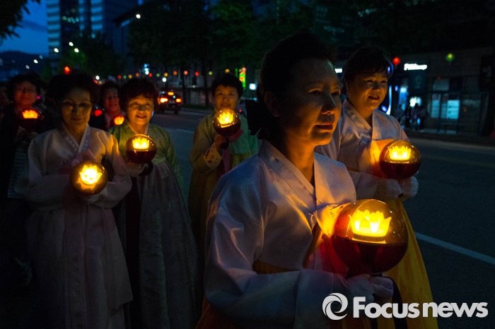 (서울=포커스뉴스) 4일 오후 서울 종로구 조계사에서 열린 연등 점등식에 참석한 불자들이 점등식 후 거리 행진을 하고 있다.