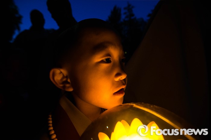 (서울=포커스뉴스) 조계사 스님과 동자승들이 4일 오후 서울 종로구 조계사에서 열린 연등 점등식이 끝나고 거리 행진을 하고 있다.