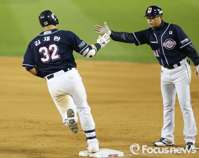 (서울=포커스뉴스) 4일 서울 잠실구장에서 열린 2016 프로야구 두산-LG 경기 9회초 2사후 두산 김재환이 우월 솔로 홈런을 치고 1루에서 한혁수 코치와 하이파이브하고 있다.