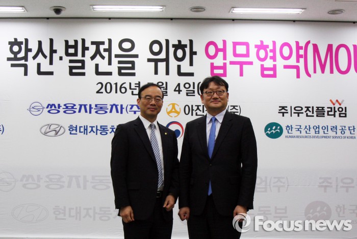 이를 통한 자격증 취득자는 현장 중심의 지식과 기술을 동시에 습득할 뿐만 아니라 다양한 취업 기회를 얻을 수 있다. 기업은 실무형 우수 인재 확보는 물론 교육과 훈련, 채용 등의 비용절감이 가능하다.지난 4일 쌍용자동차 대전연수원에서 열린 협약식에서 신영식 쌍용자동차 마케팅본부장 전무(왼쪽)와권기섭 고용노동부 직업능력정책국장이 협약서 체결 후 기념촬영을 하고 있다.<사진제공=쌍용자동차>