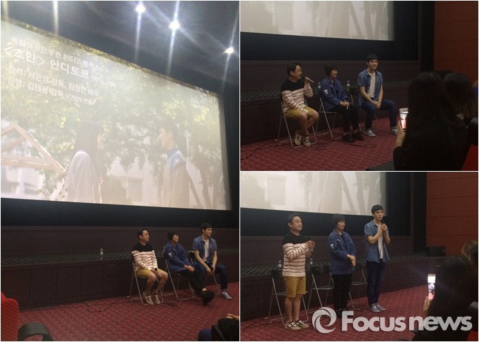 (서울=포커스뉴스) 영화 '거인'을 연출한 김태용 감독이 영화 '초인'의 서은영 감독과 배우 김정현에게 말을 건넸다. 5일 서울 종로구 인디스페이스에서 열린 영화 '초인' 관객과의 대화(GV) 자리에서다.