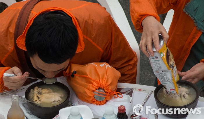 (서울=포커스뉴스) 6일 오후 서울 반포한강공원에서 열린 삼계탕 파티에 참석한 중국 건강보조제품 회사 중마이그룹 직원들이 삼계탕을 먹고 있다. 이날 한강공원을 찾은 4천여명의 중마이그룹 직원들은 삼계탕 파티와 태양의 후예 OST 미니 콘서트 등을 즐겼다.