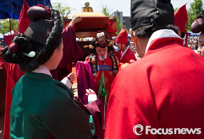 (서울=포커스뉴스) 7일 오전 서울 구로구 궁동저수지생태공원에서 '정선옹주 시집가는 날' 참가자들이 전통혼례를 재현하고 있다. 정선옹주는 조선 14대 임금인 선조와 후궁 정빈 민씨의 딸이다.